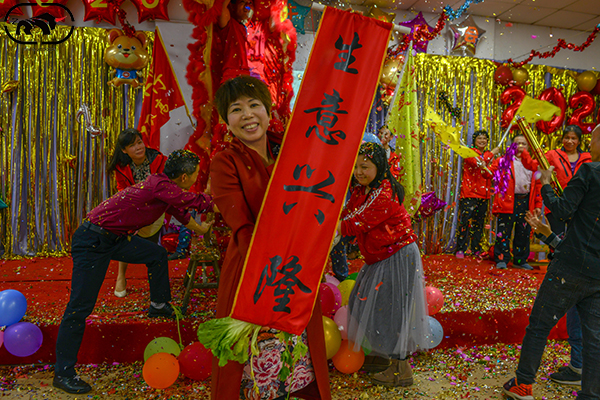 獅子在“獅子郎”的引導(dǎo)下,表演騰翻、撲跌、跳躍、登高、朝拜等技巧;最最主要的高潮采青,獅子獵取懸掛于高處的“利是”(以生菜為多),圖片中展示了獅子將獵取的“利是”扔向華姐的手中,以及“生意興隆”對(duì)聯(lián),愿2020年紅紅火火、生意興隆、事事平安;