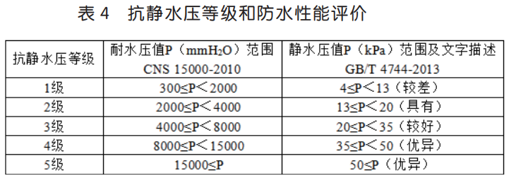 可見,防水透濕面料倒杯 - 蒸發法的透濕率基本符合正態分布,≤ 4000g/(m2·24h)的比例為10.0%,> 10000g/(m2·24h)的比例 10.0%,一半以上測試結果集中在 5000~ 9000 g/(m2·24h)。而靜水壓測試結果相對比較分散,≤ 30kPa 的比例為 16.0%,> 170kPa 的比例為 12.0%,70% 以上的測試結果大于 70kPa。以 GB/T 32614-2016《戶外運動服裝 沖鋒衣》中對沖鋒衣面料 I 級功能性要求而言,即洗滌前透濕率≥ 5000g/(m2·24h),靜 水 壓 ≥ 50kPa,50 塊 面 料 透 濕 率 合 格 率 為84.0%,靜水壓合格率為 82.0%,合格率基本一致。但靜水壓指標相對更好,三分之二的樣品靜水壓> 100kPa,遠遠滿足標準要求,這也驗證了靜水壓指標通過在織物表面的涂層處理很容易符合標準要求。將 GB/T 4744-2013《紡織品 防水性能的檢測和評價 靜水壓法》及臺灣標準 CNS 15000-2010《防水透濕紡織品性能評估》[8] 對靜水壓的評價性能列如表 4 所示。