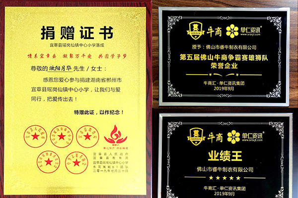 大家看一下下面的獎項就知道睿牛制衣還是個不錯的良心企業也是一家有實力的沖鋒衣生產廠家,我們的總經理同時也是非常有愛心的,她經常做善事來匯報社會,因為她 出生在70年代從小的生活也是很艱苦的,他非常能夠理解學生渴望讀書的那種心情,所以我們老板歐陽月華女士特地愛心參與捐贈宜章縣瑤崗仙鎮中心小學落成,凝聚萬千愛,共圓心學子夢!還有我們總經理系上絲帶的照片,讓大家共同把愛傳遞出去!