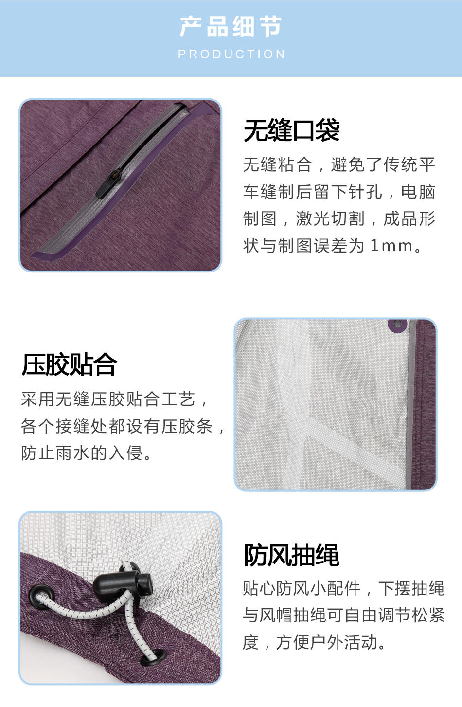 防風(fēng)抽繩:貼心防風(fēng)小配件,下擺抽繩與風(fēng)帽抽繩可自由調(diào)節(jié)松緊度,使戶外過膠沖鋒衣更方便戶外活動。