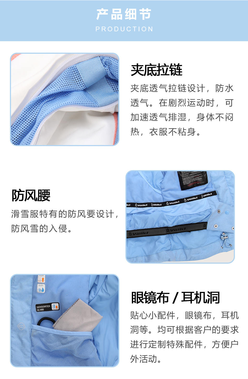 防水拉鏈采用無縫壓膠防水拉鏈激光熱封工藝貼合,面料采用進口防水透氣涂層膜,使防水透氣膜與面料完美結(jié)合。可根據(jù)客戶需求完成戶外沖鋒衣定制。