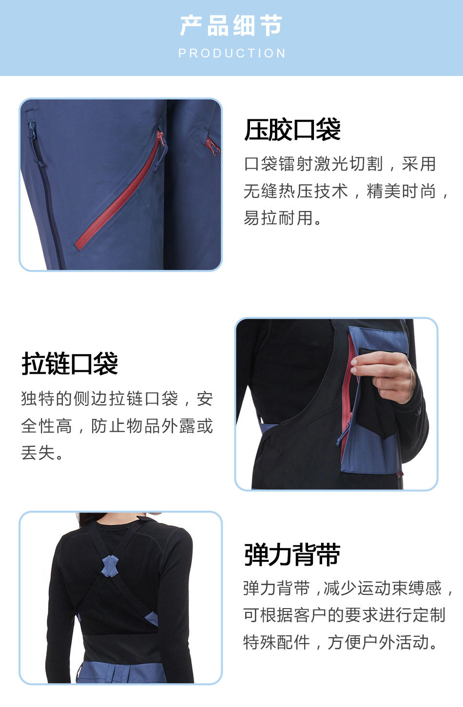 彈力背帶:彈力背帶,減少運動束縛感,可根據客戶的要求進行定制特殊配件,方便戶外活動。